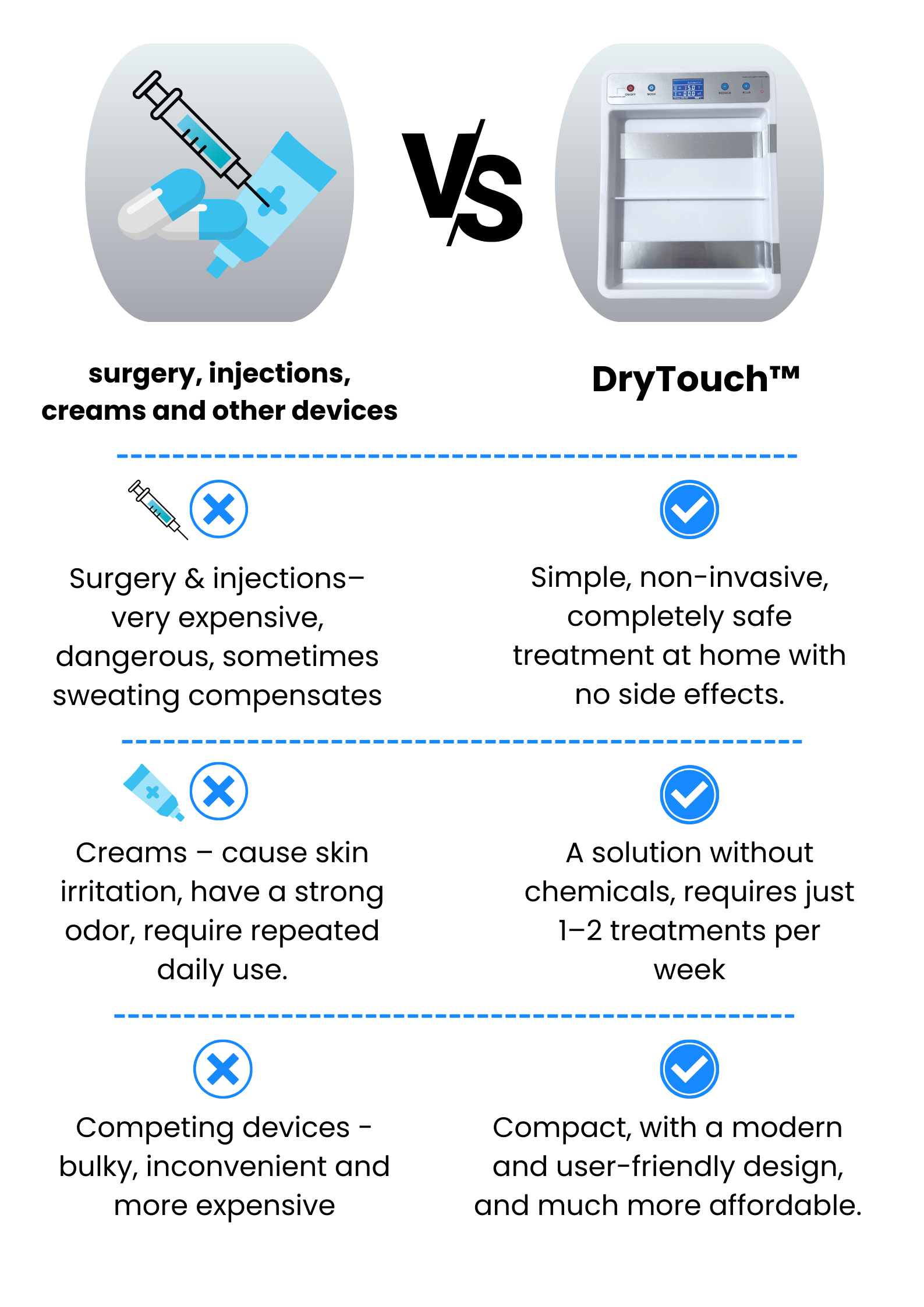 Using advanced iontophoresis technology, DryTouch™ delivers a mild, controlled electrical current through water to target the sweat glands in your hands. This temporarily interrupts the signals from your nerves that tell the glands to produce sweat – meaning your hands stay dry for days at a time.